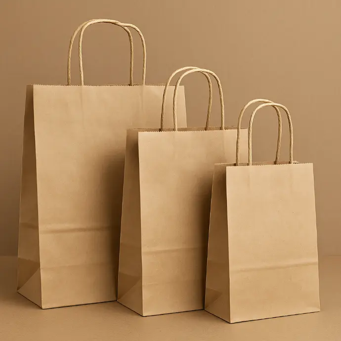 Brown or white kraft bags with twisted handles, perfect for takeout orders. Option to add your company logo.