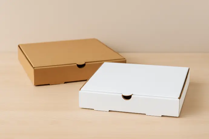 Boîtes à pizza en kraft et blanches conçues pour résister à la chaleur et préserver la fraîcheur de vos produits. Disponibles en plusieurs formats afin de répondre à tous les besoins.