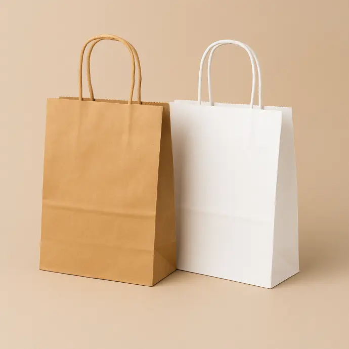 Sacs en kraft brun ou blanc avec poignées torsadées, parfaits pour les commandes à emporter. Possibilité d’ajouter le logo de votre entreprise.